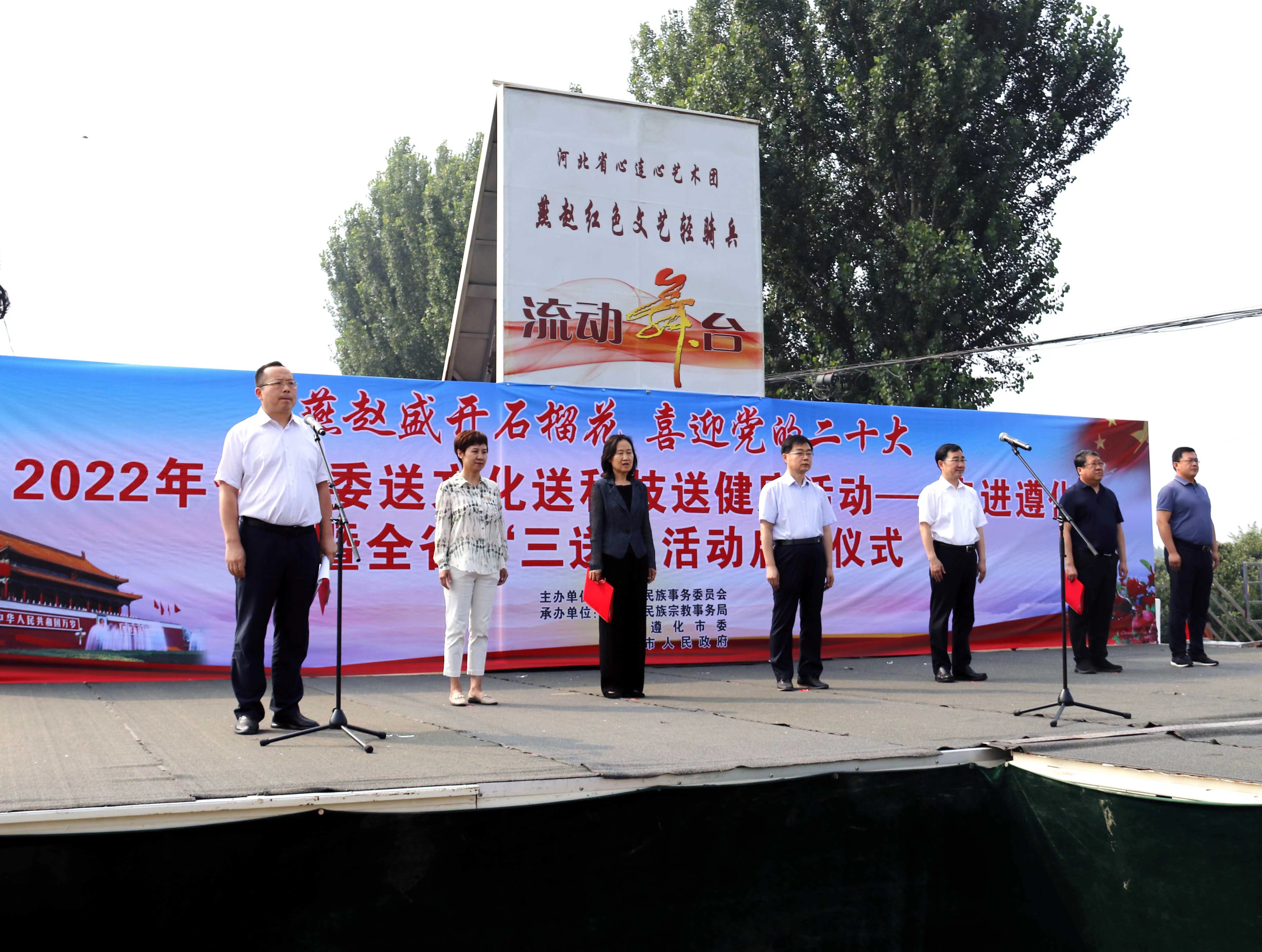 为大力营造喜迎党的二十大的浓厚氛围,铸牢中华民族共同体意识,7月20日,“燕赵盛开石榴花 喜迎党的二十大——2022年省民委送文化送科技送健康活动”启动仪式和观摩交流活动在唐山遵化市举行。省民委党组书记张少华出席并宣布“三送”活动启动。省民委党组成员、专职委员李红芳出席启动仪式并讲话。唐山市委常委组织部长、统战部长张旭出席。遵化市委书记王凤海致辞。启动仪式由唐山市民族宗教事务局党组书记、局长冯会章主持。省委宣传部、省卫健委相关处室负责同志,唐山、遵化市委市政府有关领导,各市民宗局分管局长和民族科长,有关县(市、区)民宗局长,遵化市基层干部群众、共青团和中小学生代表等共200余人参加启动仪式。
