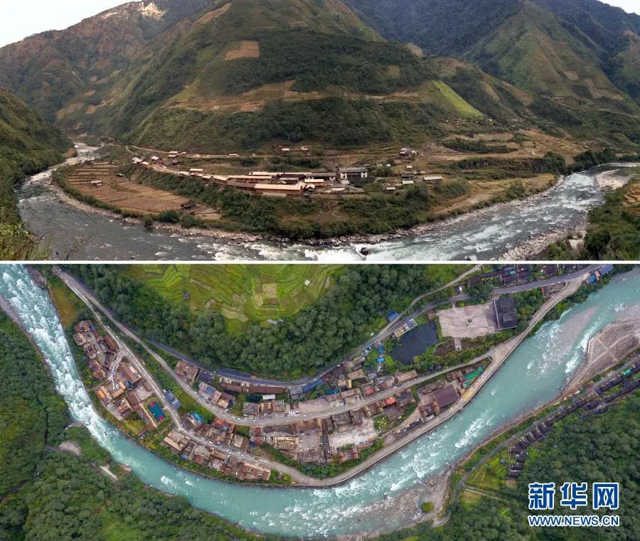 ▲拼版照片 上图:2001年拍摄的独龙江乡孔当村(资料照片);下图:2020年10月27日拍摄的独龙江乡孔当村(无人机照片)。新华社记者胡超摄