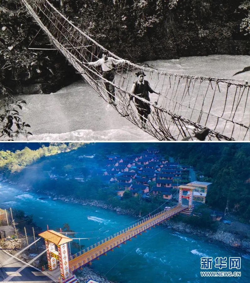 ▲拼版照片 上图:独龙族群众通过藤篾桥(资料照片);下图:独龙江乡白来感恩大桥(无人机照片)。新华社记者胡超摄