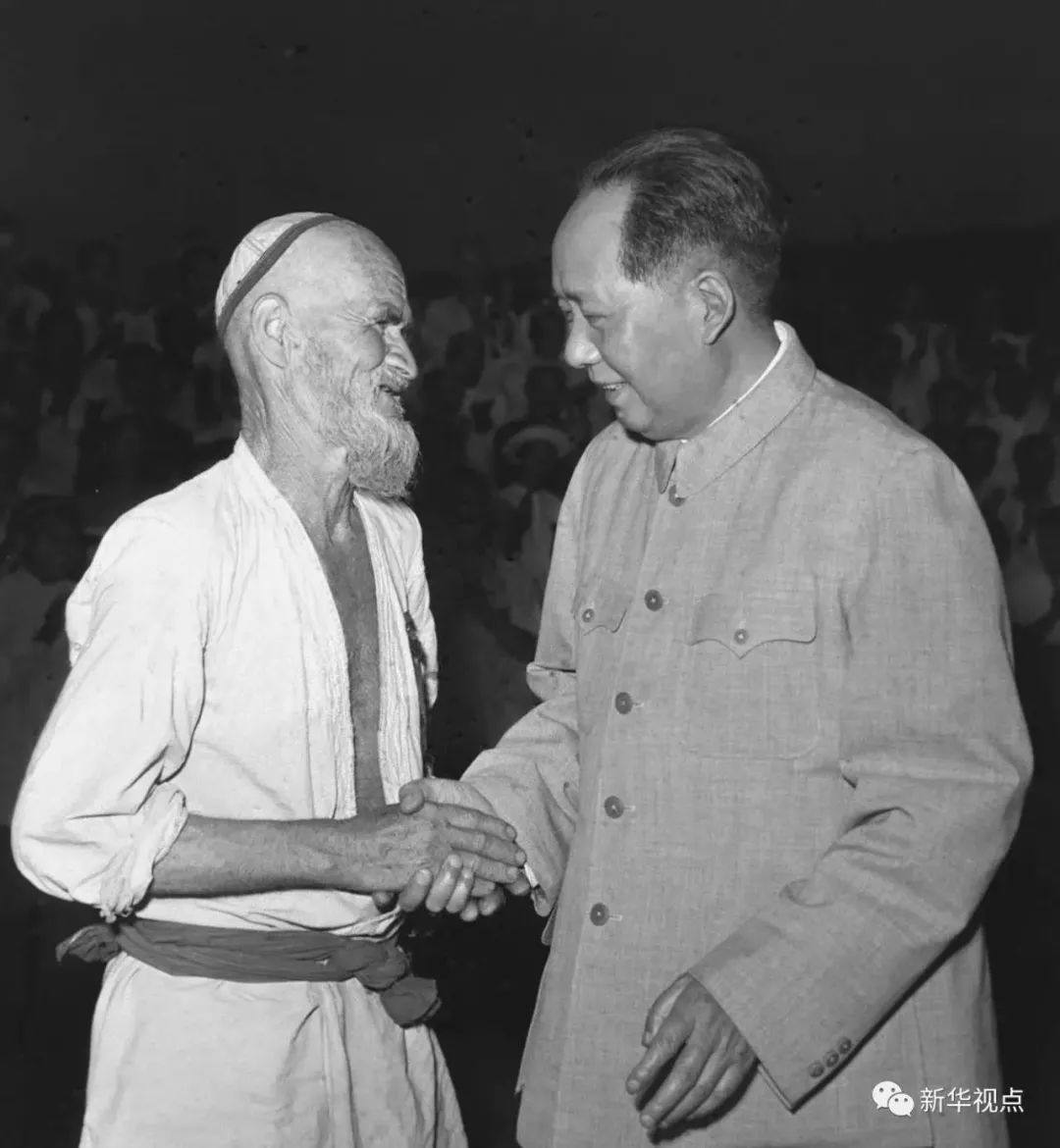 在新疆维吾尔自治区和田市的团结广场上,矗立着一座巨大的雕像:毛泽东主席亲切地与一位维吾尔族老人握手,眼中满是慈祥与厚爱。走进和田的老乡家,几乎家家都可以看到毛主席与这位老人握手的图片。
