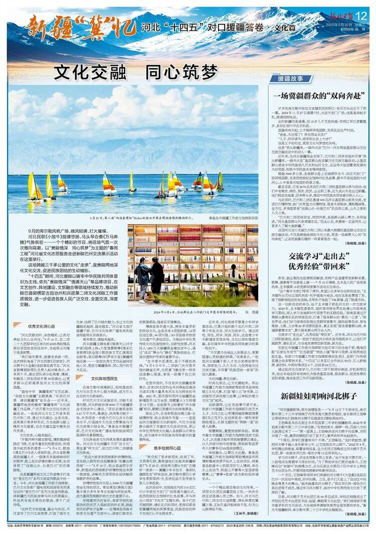 “十四五”期间,河北援疆以铸牢中华民族共同体意识为主线,依托“冀疆情深”“情满天山”等品牌项目,在文艺创作、阵地建设、文旅融合等领域持续发力,推动新疆巴音郭楞蒙古自治州和兵团第二师文化润疆工作提质增效,进一步促进各族人民广泛交往、全面交流、深度交融。