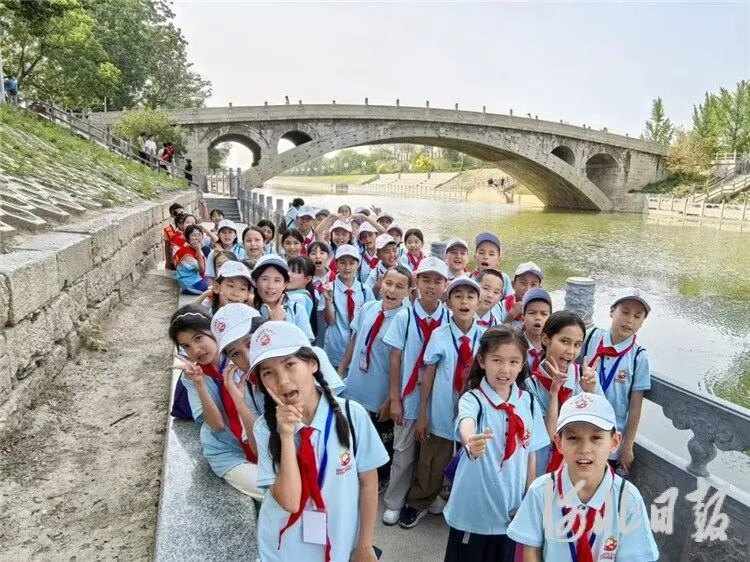 今年5月,“石榴籽一家亲——冀疆少年手拉手高举队旗跟党走”研学活动走进石家庄,巴州少年与赵州桥合影。唐焱摄