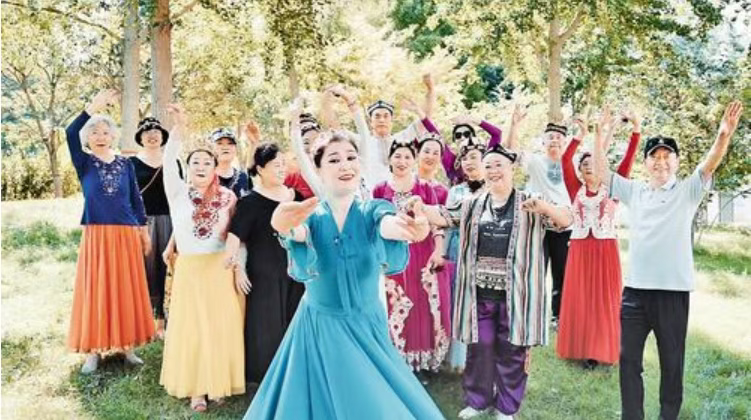 新疆姑娘帕丽与社区各族群众一起载歌载舞。