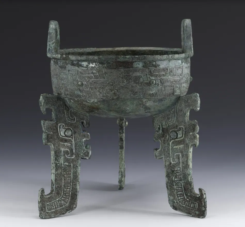 商龙纹扁足鼎及其上的饕餮纹图案。图源:人民日报