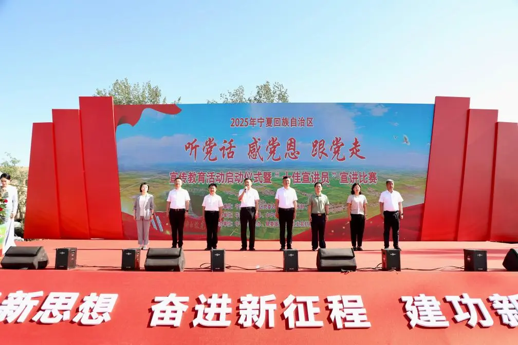 ▲8月12日,2025年宁夏全区“听党话、感党恩、跟党走”宣传教育活动启动仪式暨“全区十佳宣讲员”宣讲比赛,在中卫市中宁县余丁乡黄羊村全面开启。新华网发