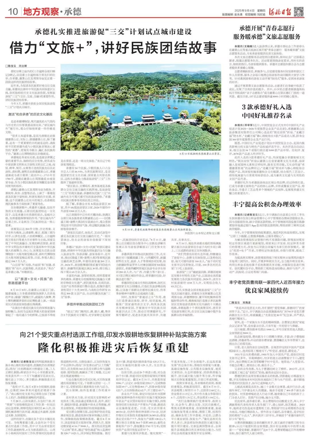 近年来,为促进各民族更好地交往交流交融,承德突出铸牢中华民族共同体意识主线,依托独特的历史文化旅游资源,发挥旅游促“三交”(交往、交流、交融)的重要作用,讲好民族团结故事。