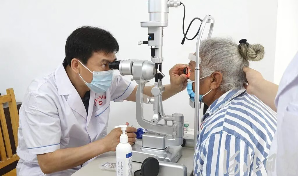 今年6月,沧州市援疆医疗队邀请沧州市眼科医院专家团队赴轮台县开展“光明行”白内障义诊手术。图为沧州眼科专家(左)为患者做术前检查。河北日报记者张晓超摄