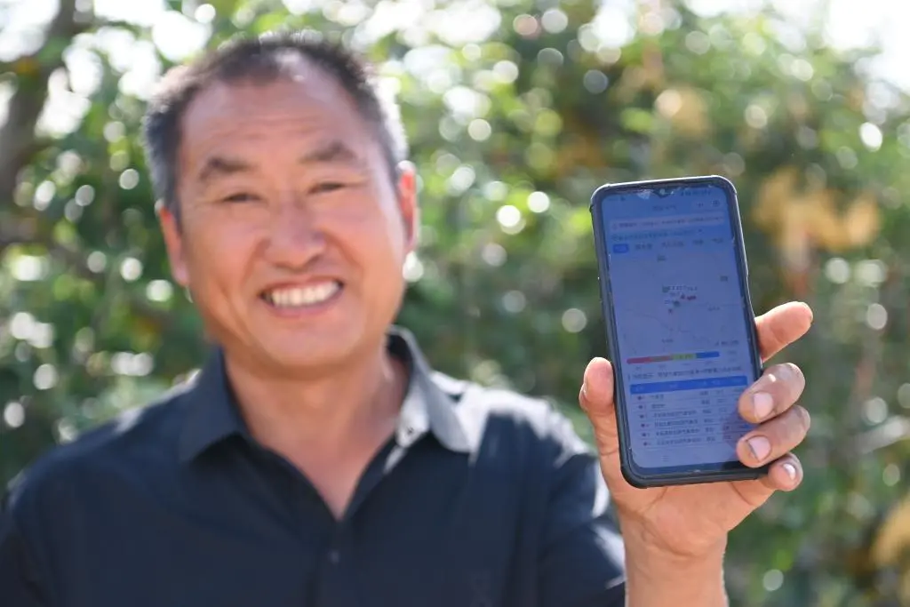 ▲ 陕西延安吴起县果农刘岳在果园展示“苹安天气”小程序(7月8日摄)。新华社记者邹竞一 摄
