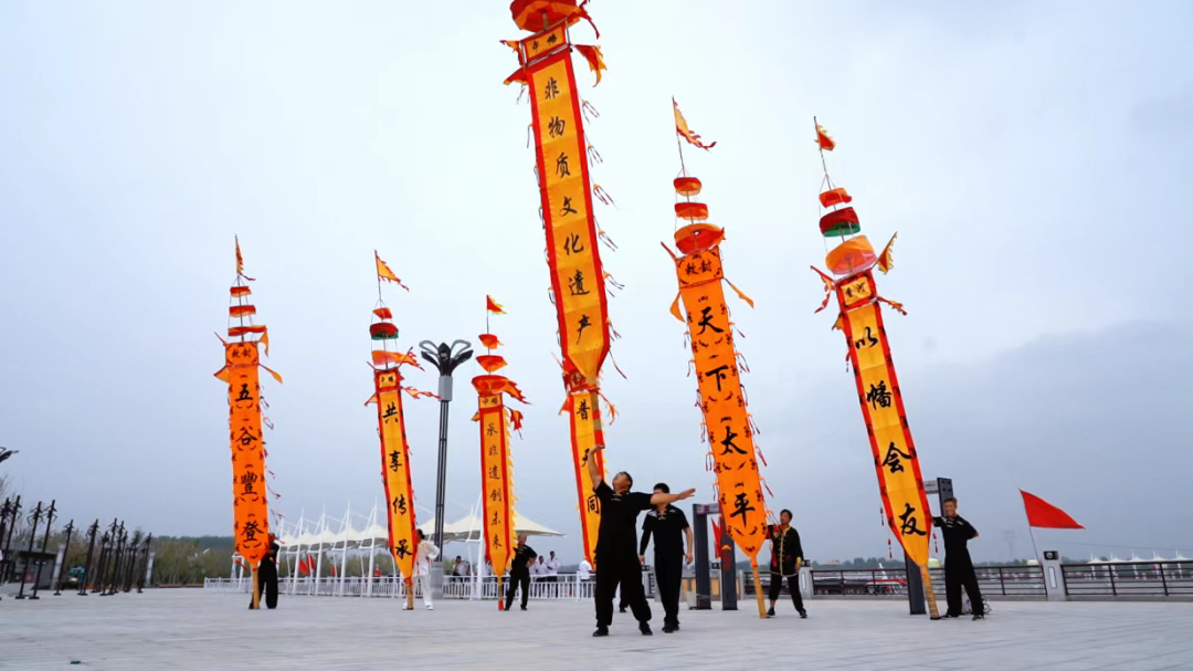 此时,码头广场上,一场安头屯中幡表演正在上演。十余米高、几十斤重的彩幡,在表演者的头顶、肩头、肘臂之间灵活飞舞,始终做到幡不离身、竿不落地。安头屯中幡第十代传承人刘志强自豪地介绍,这门融合了杂技与武术的民间技艺,起源于隋唐时期,舞动的中幡由船上的桅杆演变而来。咸丰元年,中幡会奉诏进京,在登基大典上表演,获敕封“国泰民安”幡面。如今,这面珍贵的幡旗珍藏于香河县博物馆内。“‘国泰民安’这四个字,自古至今都是老百姓最朴素的愿望,也是各族儿女共同的向往。”刘志强动情地说。