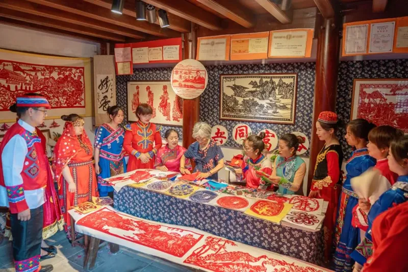 ▲“之江同心?石榴红”志愿服务队的志愿者们正在教少数民族同胞学一些简单的剪纸。图片来源:新昌县委统战部