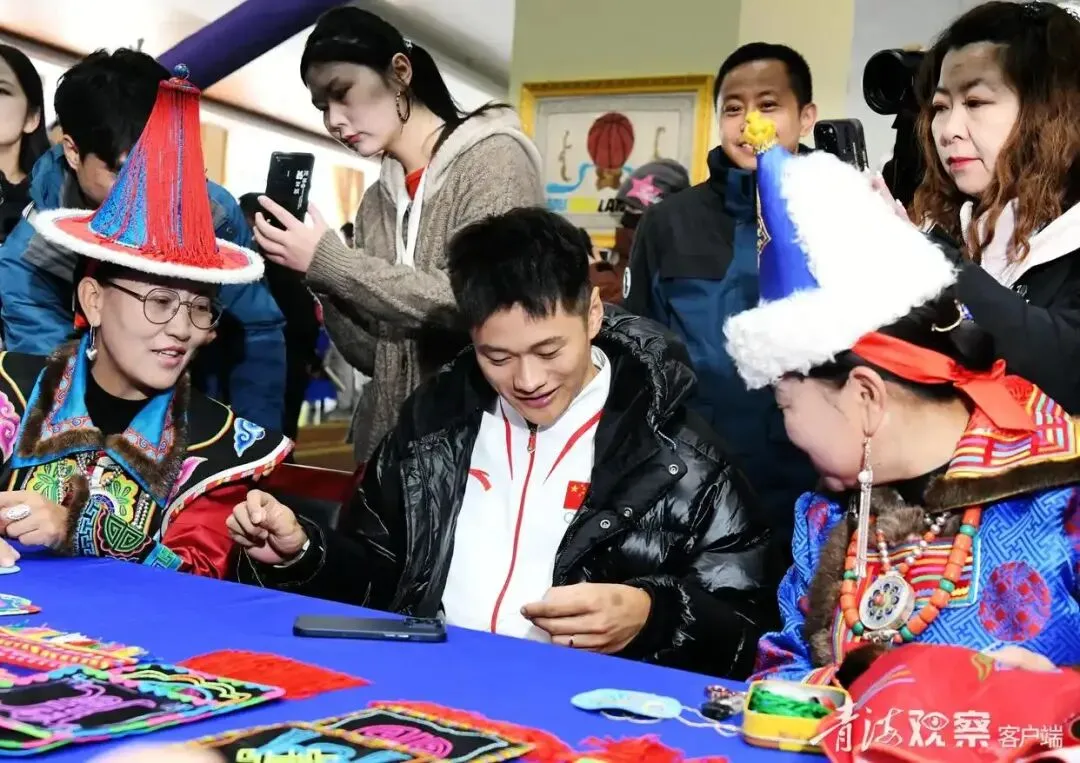 ▲奥运健儿体验青绣。青海日报融媒体记者 李庆玲 摄