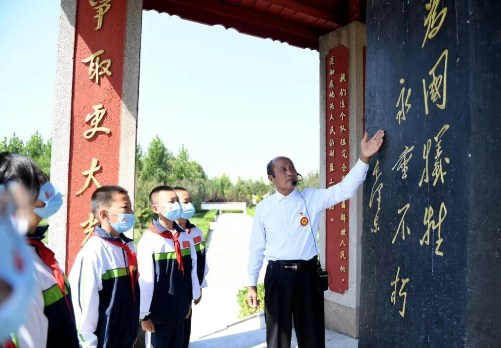 阜城县烈士陵园保安员王志杰向学生们讲述回汉军民共同抗战的故事。