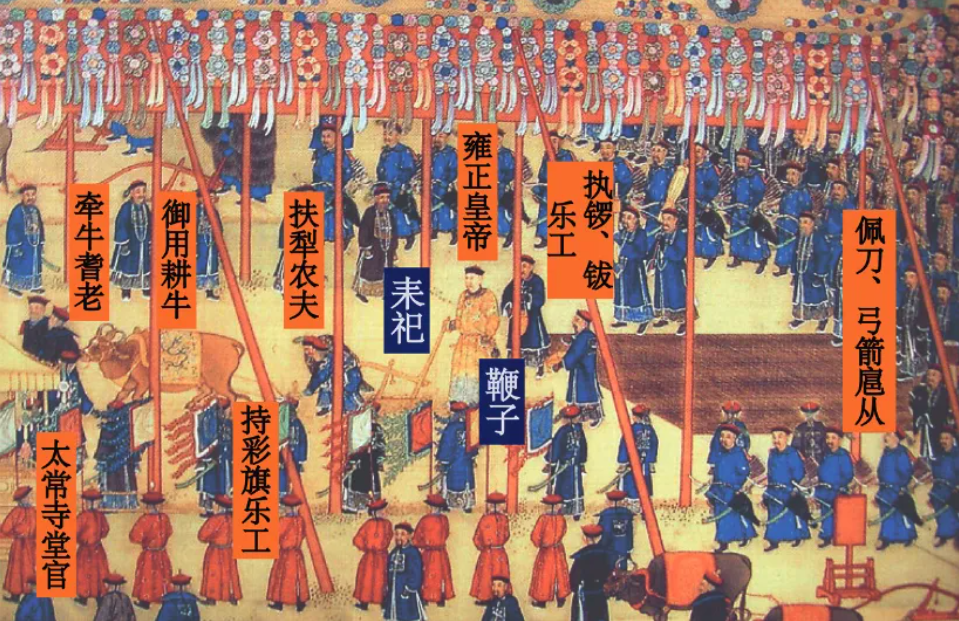 雍正皇帝身着黄龙袍,步入耤田(天子亲耕的田地),手持农具,在耆老牵牛、农夫扶犁的辅助下,行“三推三返”之礼,更特意复加一推,以表劝农务本之至诚。