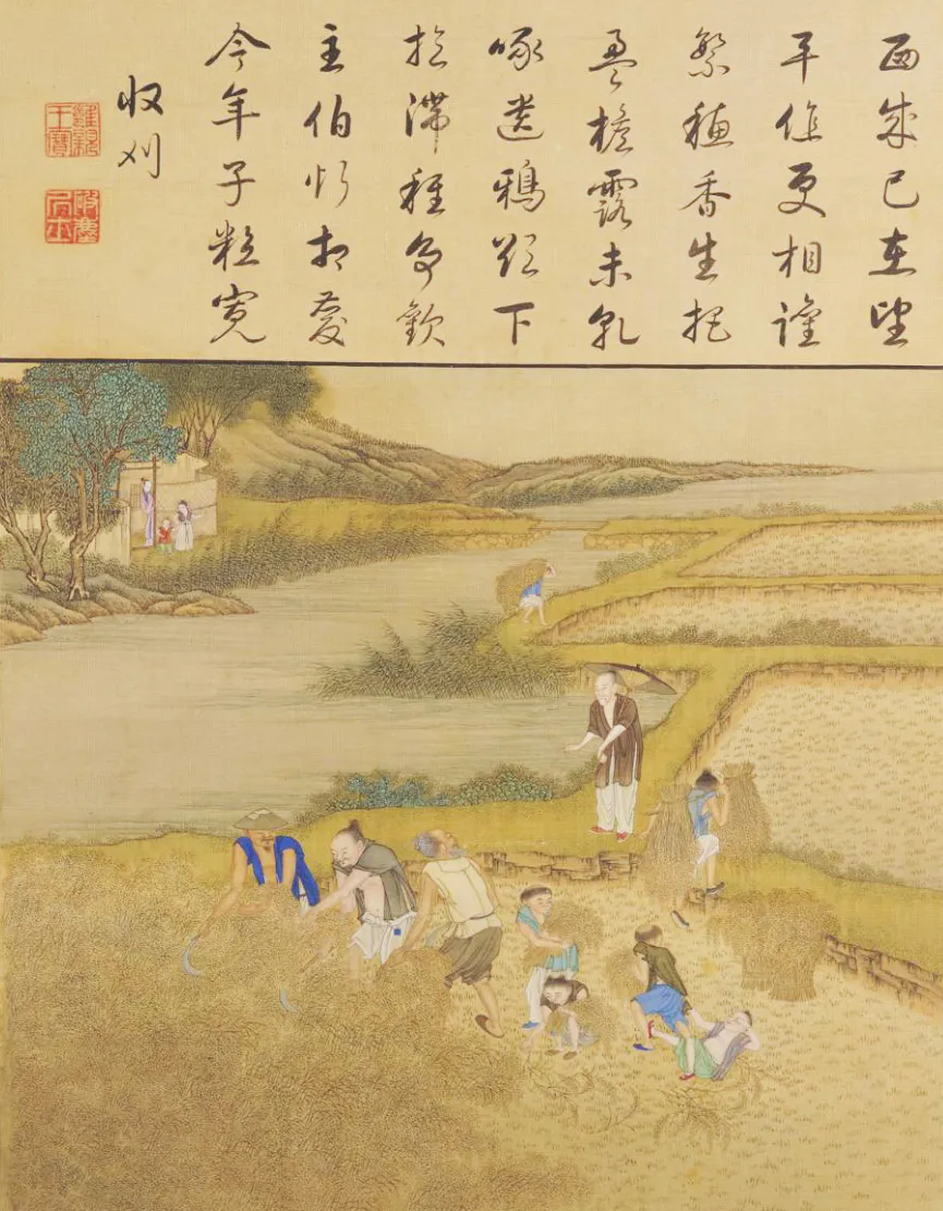 ▲清,《胤禛耕织图册·收刈》页,描绘麦田中农夫装扮的胤禛正带领众人收割。(图片来源:故宫博物院官网)